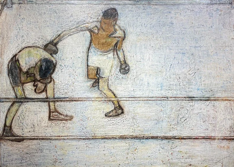 “At first it was Sam Rabin’s paintings that caught my imagination, simple: non-visceral representations of boxers in a boxing ring, sometimes with a referee, sometimes without. The overall effect was of a group of brightly coloured butterflies caught in a trap made of white strings. They did not have to be paintings of boxing matches; such was the degree of abstraction achieved by the artist. Then, on closer inspection, I realised there were recognisable stances, moves and counter moves, that were familiar to me from my limited experience of watching boxing with my father at Streatham Baths as a young boy, or the occasional big fight coverage in the cinema of a bout featuring mostly world champions, Joe Louis or Rocky Marciano, or even one of Britain’s many horizontal heavyweight challengers.