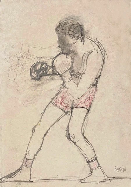 In 1986 my daughter, Rebecca, having graduated with a degree in Fine Art, had recently begun to paint large canvases of boxers and boxing matches. She explained that her inspiration lay in the works of Sam Rabin. The Dulwich Picture Gallery, London, had mounted a one man show for Rabin in November 1985. The exhibition was curated by John Sheeran who researched and wrote the catalogue. Did she still have a copy of the catalogue? She did. I was enthralled. Where could I see this art? This was nigh on impossible. Very little of Rabin’s output is available for public viewing. Only the British Museum, the Manchester Art Gallery and the Salford Art Gallery own a few works. Most were, at the time, either in private collections or still owned by the artist. In any case Rabin’s output, the output that survived his periodic purges, was relatively small.
